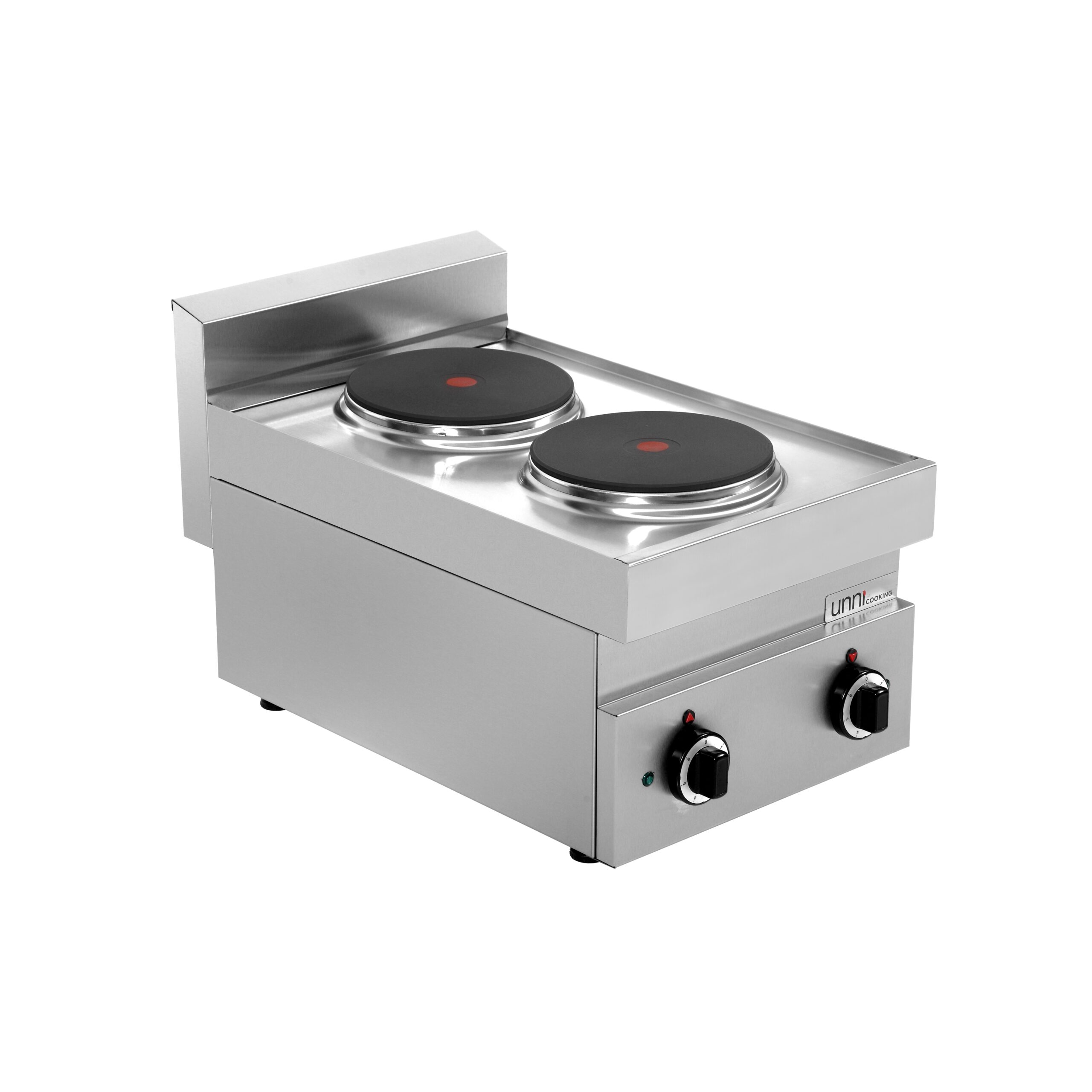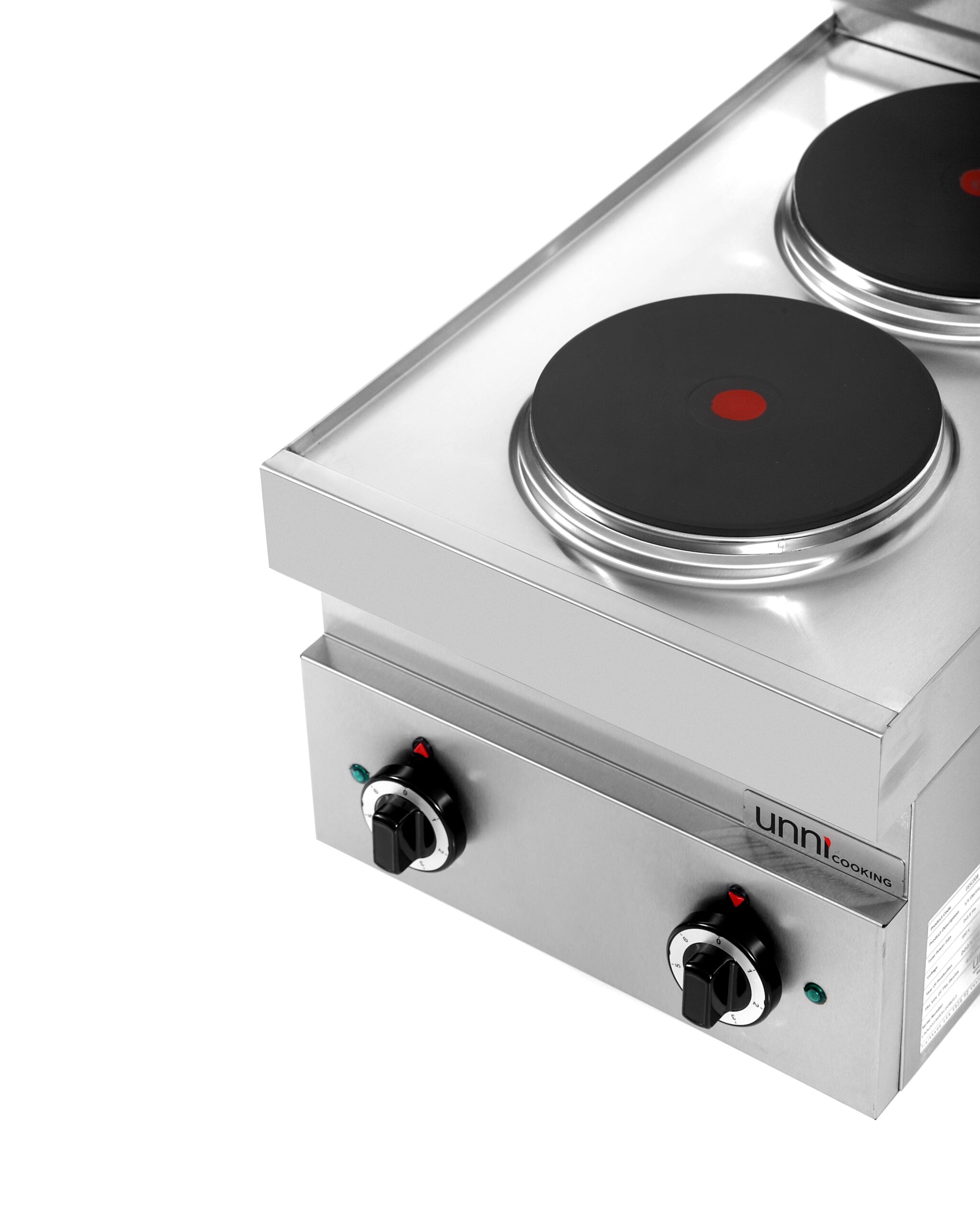 Deze hoogwaardige elektrische fornuis uit de 650 SERIE kooklijn van UNNI-COOKING is volledig gemaakt van RVS en beschikt over 2 kookpunten. Dit elektrische fornuis beschikt ook over een vet opvangschaal.