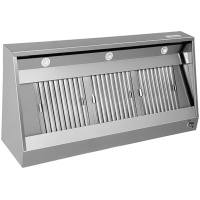 Het is gemaakt voor plaatsing tegen een wand en betreft een schuine uitvoering. Deze horeca afzuigkap is gemaakt van hoogwaardig RVS AISI 430 en is verkrijgbaar in verschillende afmetingen. Om een goede werkoppervlak verlichting te creëren zijn alle afzuigkappen voorzien van hittebestendige LED verlichting. De bekabeling is ook hittebestendig zodat hitte geen probleem kan vormen. De lamellen filters zijn uitneembaar en het binnenste gedeelte van de kap is onder 45° schuin geplaatst. Doormiddel van de aanwezige aftapkraan kan het vet gemakkelijk afgevoerd worden.