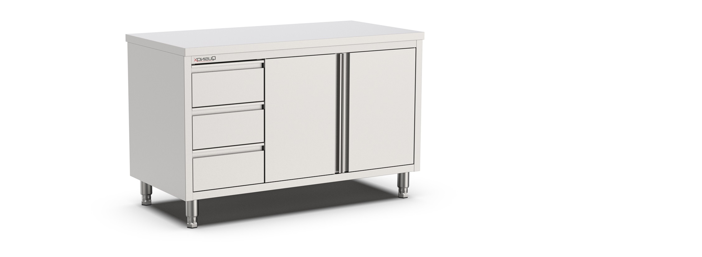 Deze hoogwaardige RVS horeca werktafel met laden en draaideuren van Qusinox heeft een diepte van 700 mm. De hoeken van het werkblad zijn compleet gelast, afgewerkt en geborsteld. De afgeronde hoeken en gladde oppervlakken maken het reinigen eenvoudig. Met de instelbare hoogte kan de werktafel op alle ondergronden stabiel geplaatst worden. Het werkblad is versterkt met water vaste onderlijming en geluiddempende MDF. De werktafel is voorzien van een onderkast met een verstelbare tussenplank en 3 laden aan de linker kant. Dit model heeft hierdoor extra opbergruimte wat erg handig is, omdat alle benodigde producten altijd bij de hand zijn en alles kan netjes opgeborgen worden. Deze werktafel is geproduceerd met duurzaam RVS AISI-430 (geborsteld) en voldoet aan alle geldende hygiëne- en veiligheidsvoorschriften.