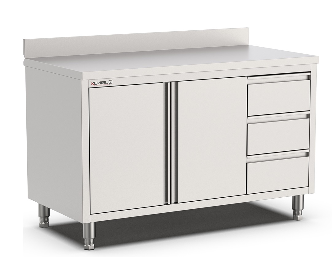 Deze hoogwaardige RVS horeca werktafel met laden en draaideuren van Qusinox heeft een diepte van 700 mm. De hoeken van het werkblad zijn compleet gelast, afgewerkt en geborsteld. De afgeronde hoeken en gladde oppervlakken maken het reinigen eenvoudig. Door de opstaande rand kan er niks achter de werktafel vallen, wat zorgt voor maximale hygiëne. Met de instelbare hoogte kan de werktafel op alle ondergronden stabiel geplaatst worden. Het werkblad is versterkt met water vaste onderlijming en geluiddempende MDF. De werktafel is voorzien van een onderkast met een verstelbare tussenplank en 3 laden aan de rechter kant. Dit model heeft hierdoor extra opbergruimte wat erg handig is, omdat alle benodigde producten altijd bij de hand zijn en alles kan netjes opgeborgen worden. Deze werktafel is geproduceerd met duurzaam RVS AISI-430 (geborsteld) en voldoet aan alle geldende hygiëne- en veiligheidsvoorschriften.