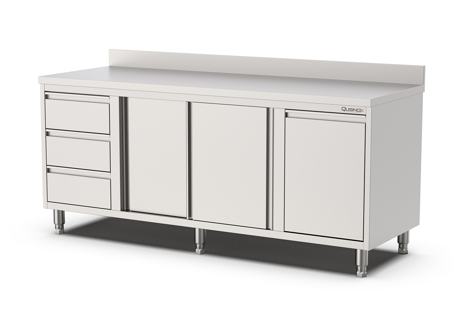 Deze hoogwaardige RVS horeca werktafel met schuifdeuren, kanteldeur en laden van Qusinox heeft een diepte van 700 mm. De hoeken van het werkblad zijn compleet gelast, afgewerkt en geborsteld. De afgeronde hoeken en gladde oppervlakken maken het reinigen eenvoudig. Door de opstaande rand kan er niks achter de werktafel vallen, wat zorgt voor maximale hygiëne. Met de instelbare hoogte kan de werktafel op alle ondergronden stabiel geplaatst worden. Het werkblad is versterkt met water vaste onderlijming en geluiddempende MDF. De werktafel is voorzien van een onderkast met een kanteldeur, 2 schuifdeuren en 3 laden aan de linker kant. Dit model heeft hierdoor extra opbergruimte wat erg handig is, omdat alle benodigde producten altijd bij de hand zijn en alles kan netjes opgeborgen worden. Deze werktafel is geproduceerd met duurzaam RVS AISI-430 (geborsteld) en voldoet aan alle geldende hygiëne- en veiligheidsvoorschriften.