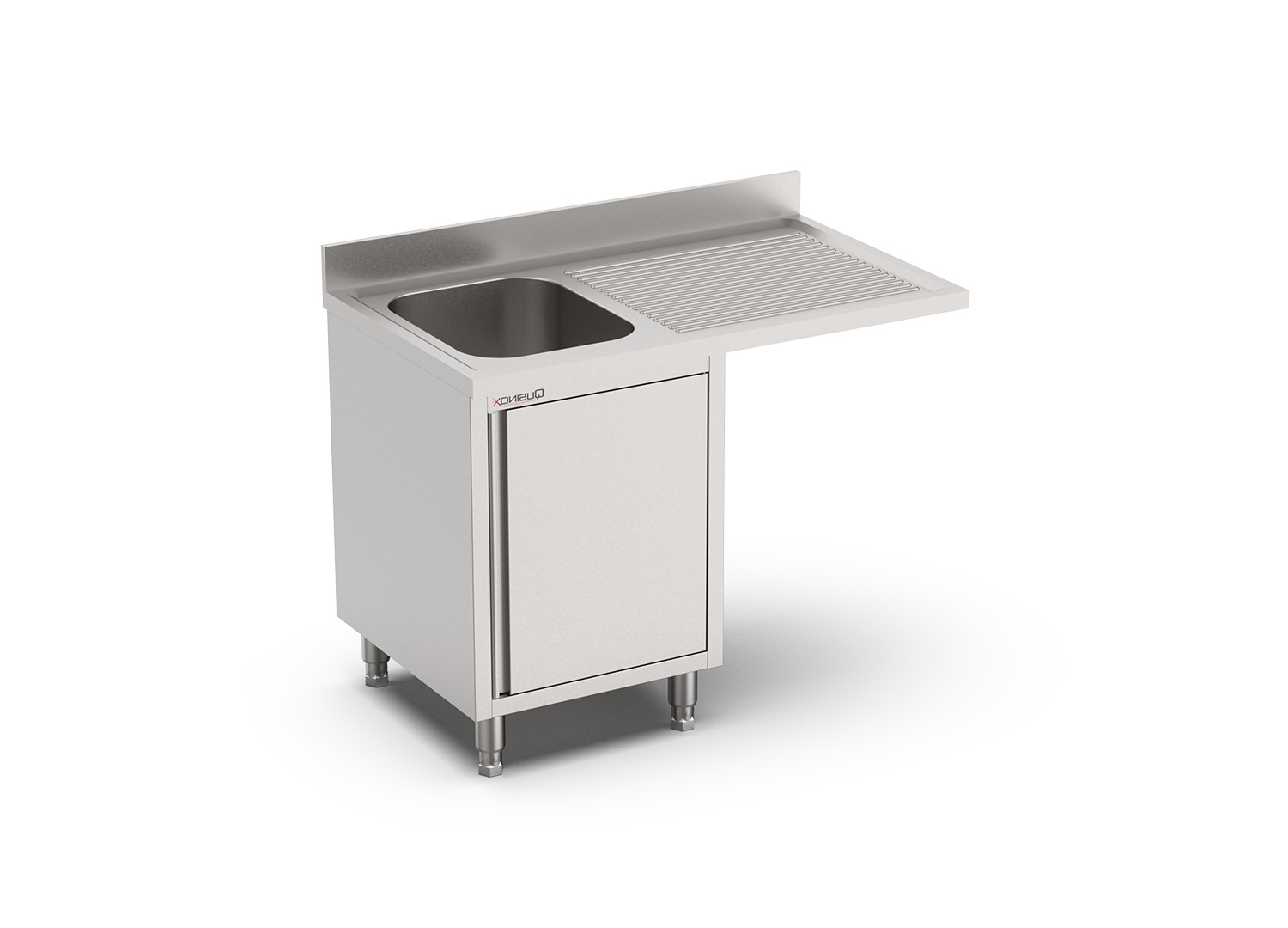 Deze hoogwaardige RVS spoeltafel met draaideur van Qusinox heeft een diepte van 700 mm. Deze RVS horeca spoeltafel is voorzien van 1 spoelbak links en ruimte voor de vaatwasser aan de rechter kant. De afgeronde hoeken en gladde oppervlakken maken het reinigen eenvoudig. Met de instelbare hoogte kan de spoeltafel op alle ondergronden stabiel geplaatst worden. De spoeltafel is voorzien van een onderkast met een draaideur. Dit model heeft hierdoor extra opbergruimte wat erg handig is, omdat alle benodigde producten altijd bij de hand zijn en alles kan netjes opgeborgen worden. Het bovenblad (spoelblad) is vervaardigd uit AISI-304. De body van deze spoeltafel is geproduceerd met duurzaam RVS AISI-430 en voldoet aan alle geldende hygiëne- en veiligheidsvoorschriften.