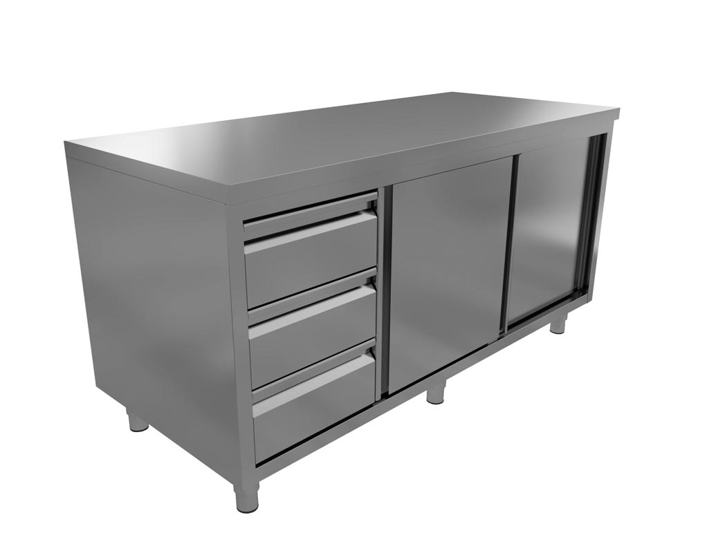 Deze hoogwaardige RVS horeca werktafel met schuifdeuren en laden van Unninox heeft een diepte van 700 mm. De afgeronde hoeken en gladde oppervlakken maken het reinigen eenvoudig. Met de instelbare hoogte kan de werktafel op alle ondergronden stabiel geplaatst worden. Het werkblad is versterkt met geluiddempende MDF. De werktafel is voorzien van een onderkast met een tussenschap en 3 laden aan de linker kant. Dit model heeft hierdoor extra opbergruimte wat erg handig is, omdat alle benodigde producten altijd bij de hand zijn en alles kan netjes opgeborgen worden. Deze werktafel is geproduceerd met duurzaam RVS AISI-430 (geborsteld) en voldoet aan alle geldende hygiëne- en veiligheidsvoorschriften.